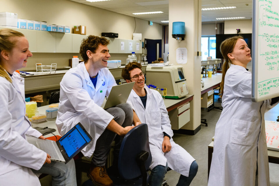 Een superleuk, spontaan moment tijdens een werkcollege aan de Universiteit Utrecht, met lachende studenten in beeld.