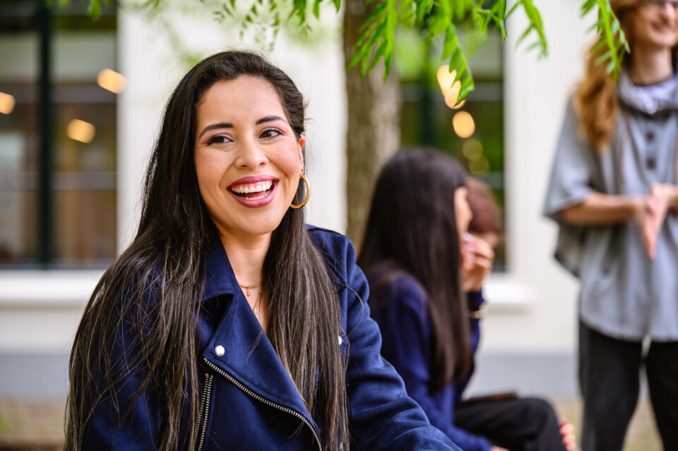 Werkoverleg met lachend portret collega voor de universiteit beeldbank, documentaire fotografie voor onderwijsmarketing